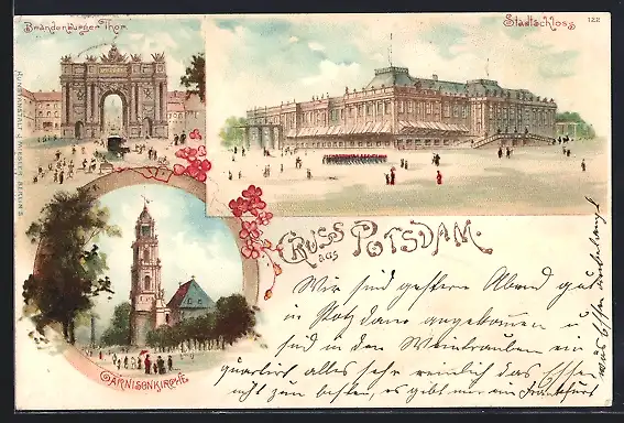 Lithographie Potsdam, Garnisonkirche, Stadtschloss, Brandenburger Thor, Blumenverzierung