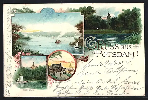 Lithographie Potsdam, Pfauen-Insel, Nikolsköe, Matrosen-Station, Segelboote, Vogel, Pfauenfedern