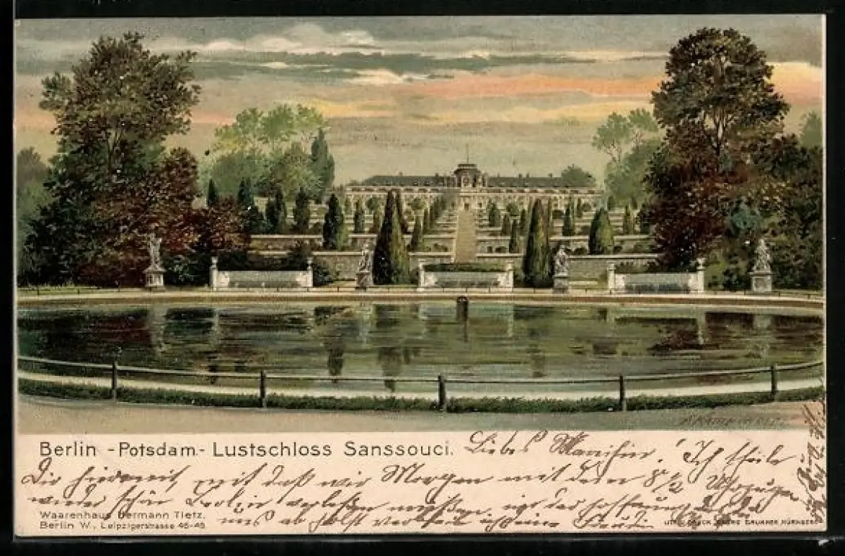 Lithographie Potsdam, Schloss Sanssouci, Blick auf Brunnen und Gartenanlagen