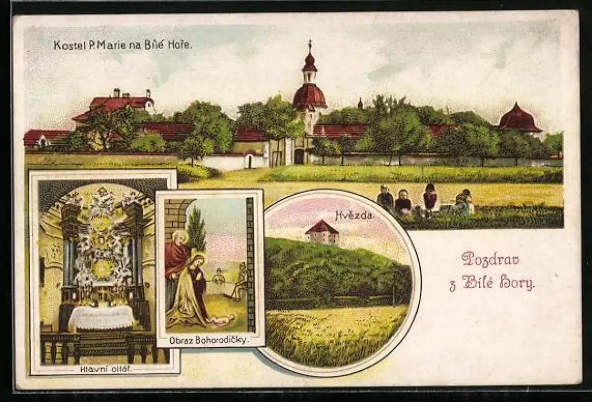 Lithographie Prag / Praha-Bilé Hory, Kostel P. Marie na Bíilé Hore, Hvezda, Obraz Bohorodicky