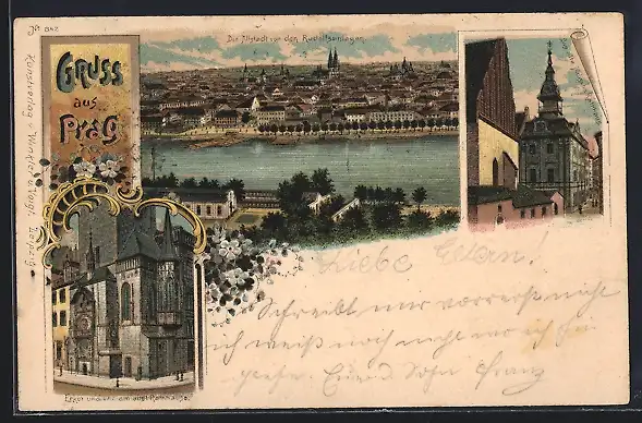 Lithographie Prag / Praha, Erker u. Uhr am altst. Rathaus, altes jüdisches Rathaus, Blick zur Altstadt