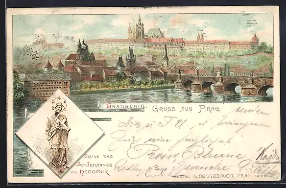 Lithographie Prag / Praha, Hradschin, Panorama der Königsburg, Statue des St. Johannes von Nepomuk