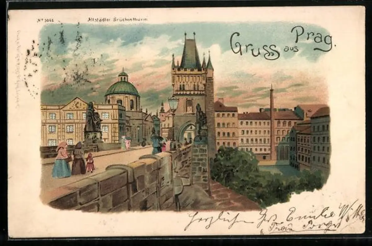 Lithographie Prag / Praha, Partie am altstädter Brückenturm