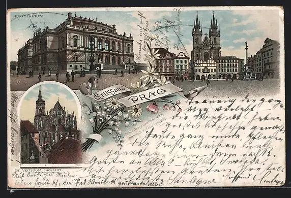 Lithographie Prag / Praha, St. Veitsdom, Gr. Ring und Teynkirche, Rudolfinum