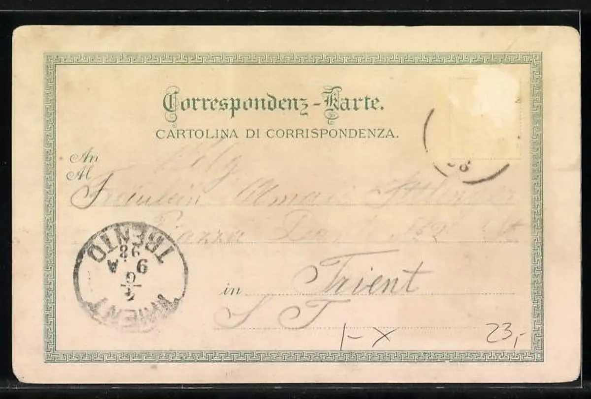 gelaufen 1898, Briefmarke entfernt, rückseitig Oberflächenschaden, Bugspur li. oben, guter Zustand