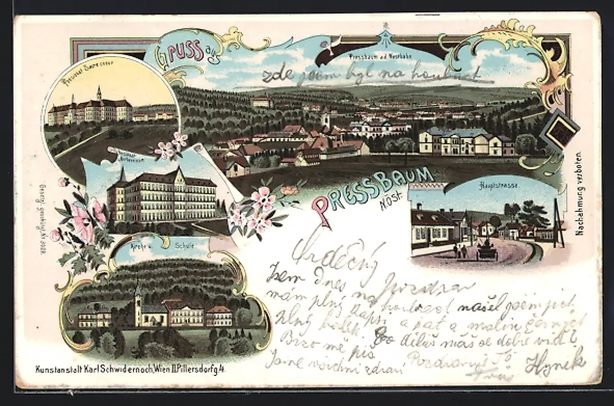Lithographie Pressbaum / Westbahn, Pensionat Norbertinum, Hauptstrasse, Kirche und Schule