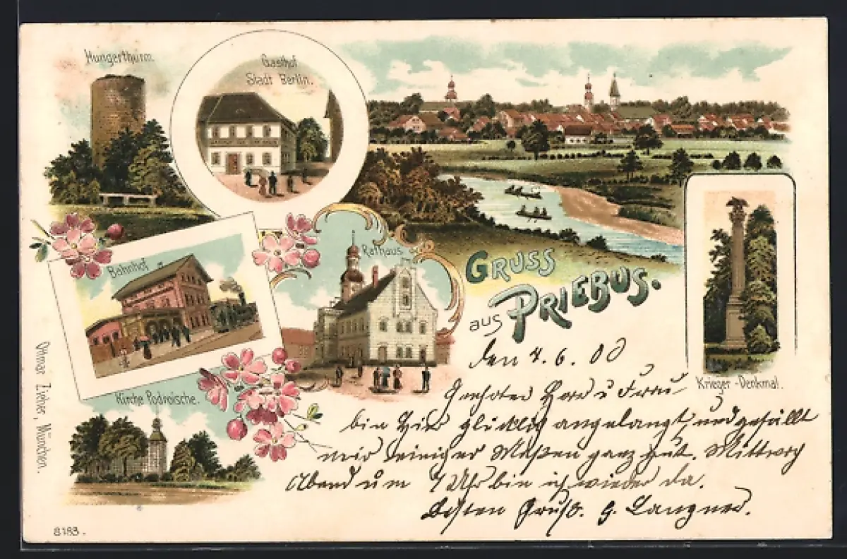 Lithographie Priebus, Gasthof Stadt Berlin, Bahnhof, Kirche Podroische