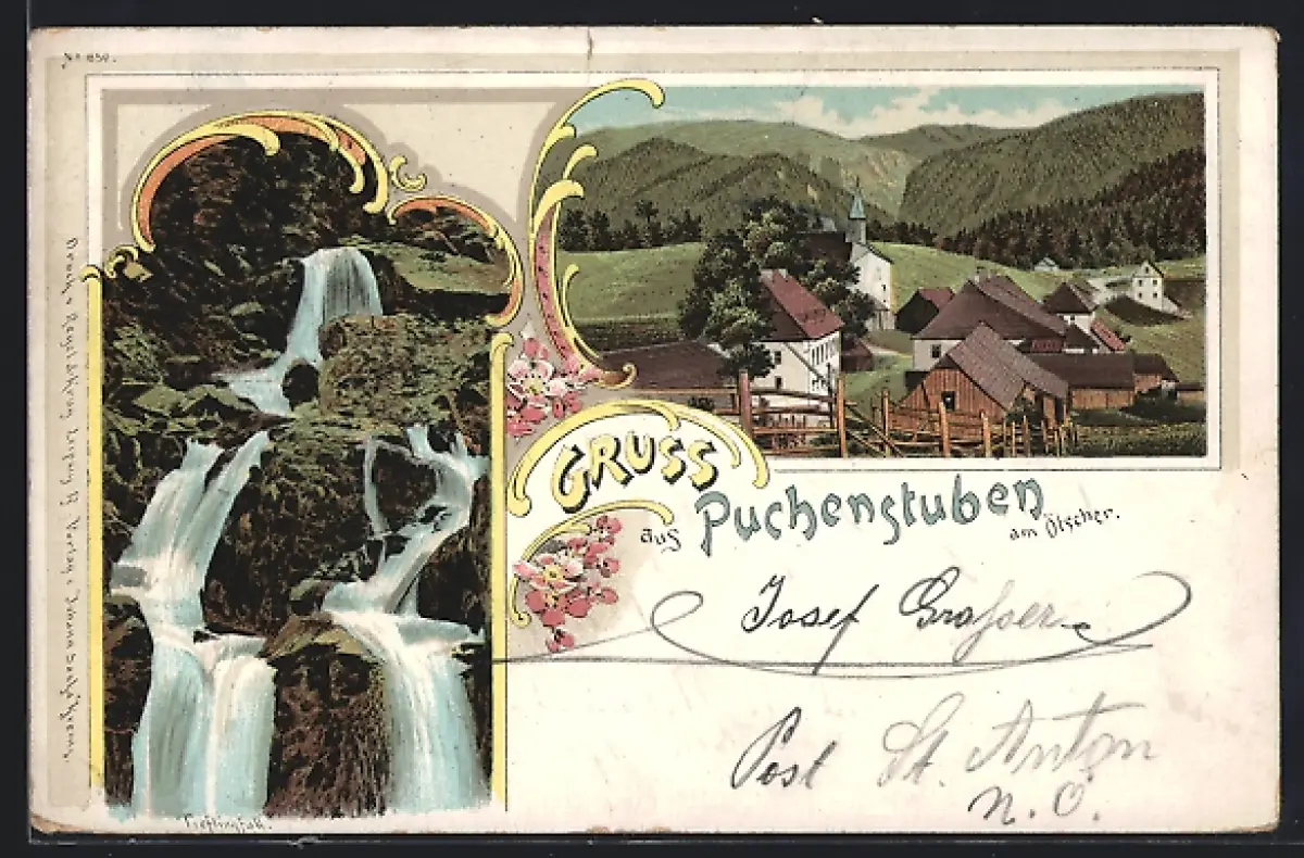 Lithographie Puchenstuben am Ötscher, Wasserfall und Panorama