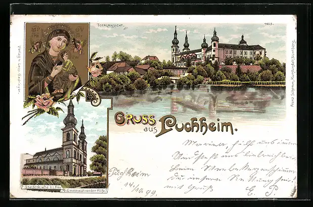 Lithographie Puchheim, Gnadenkirche u. L. Frau v. d. immerwährenden Hilfe, Gnadenbild, Totalansicht