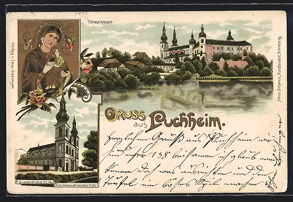 Lithographie Puchheim, Totalansicht über den See, Gnadenkirche U.L. Frau v. d. immerwährenden Hilfe