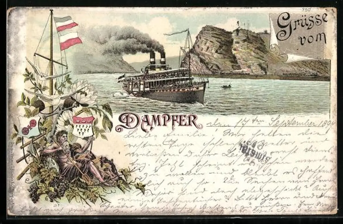 Lithographie Raddampfer auf dem Rhein vor der Loreley