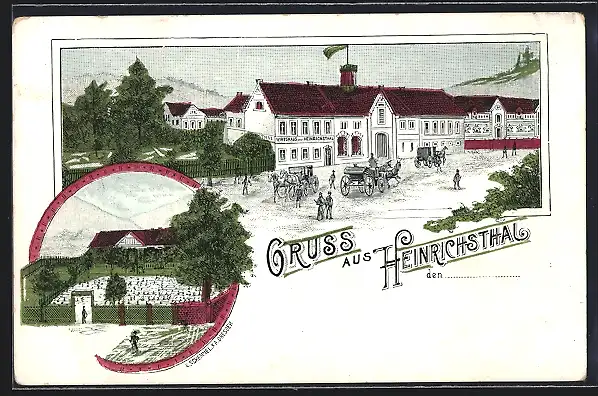Lithographie Radeberg, Gasthof Gut Heinrichsthal mit Gartenwirtschaft