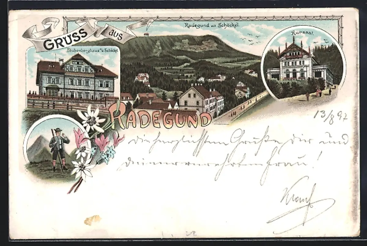 Lithographie Radegund am Schröckel, Hotel Stubenberghaus, Kursaal, Ortsansicht mit Schöckel
