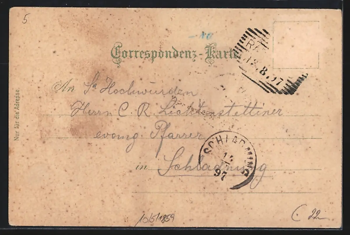 gelaufen 1897, Briefmarke entfernt, Eckknick li. oben, Stecknadelloch li. oben, guter Zustand