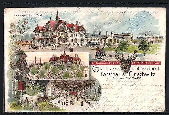 Lithographie Raschwitz, Gasthaus Forsthaus Raschwitz, Garten, Innenansicht