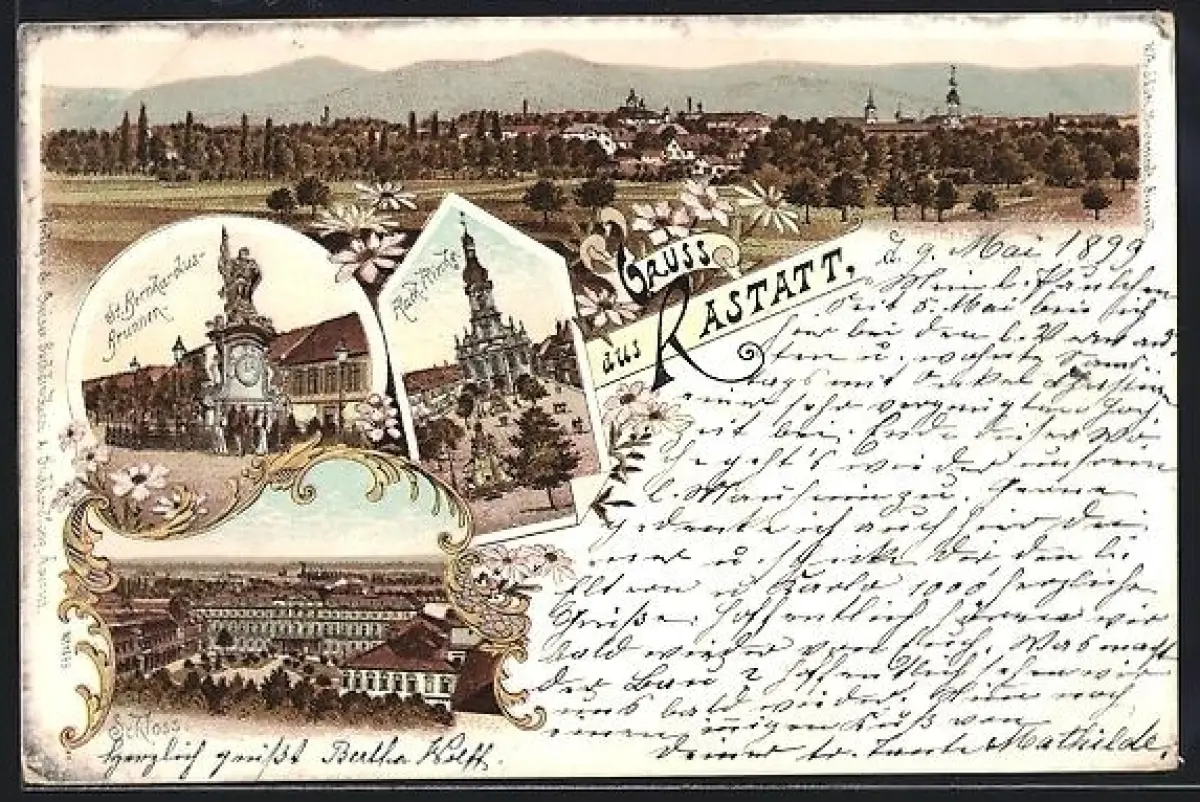 Lithographie Rastatt, St. Bernhardus-Brunnen und Kath. Kirche