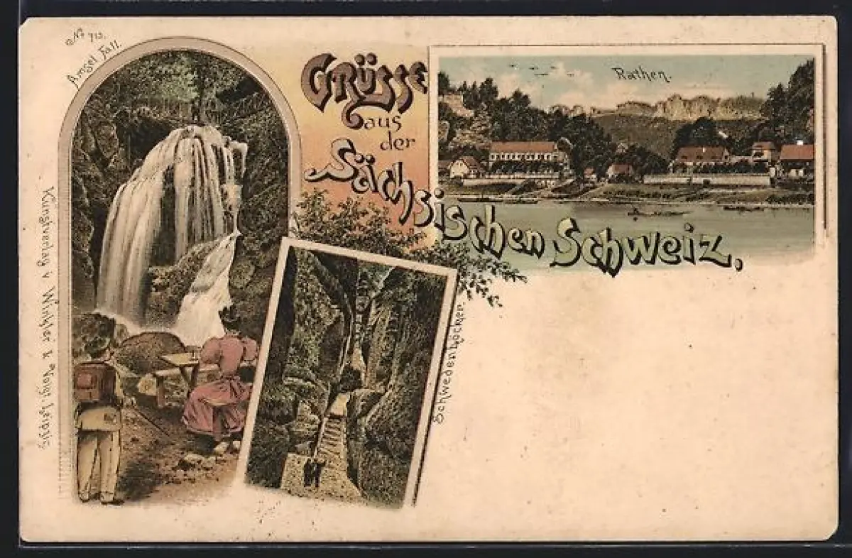 Lithographie Rathen, Amsel Fall und Schwedenlöcher