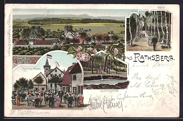 Lithographie Rathsberg, Totalansicht, Quellengebiet, Kurhaus Weiss