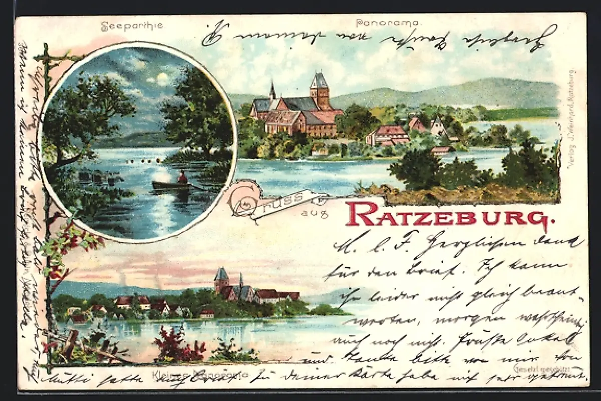 Lithographie Ratzeburg, Panorama, Seepartie bei Mondschein, Uferpartie