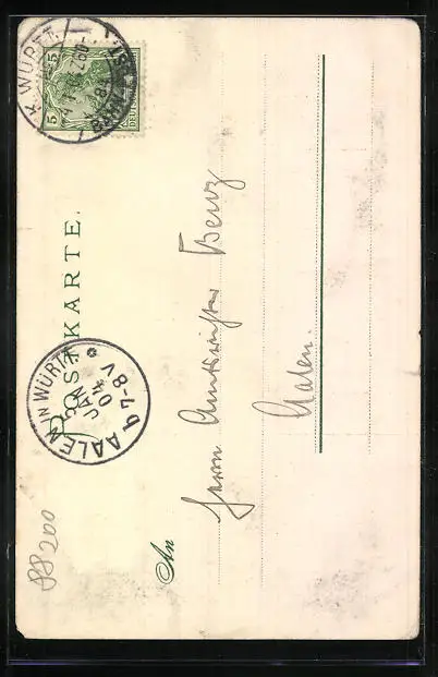 Personenbezogene Daten auf der Rückseite der Karte wurden durch blauen Textmarker unkenntlich gemacht. Die blauen Stellen sind auf die Vorderseite durchgeweicht und wirken sich negativ auf das Postkartenfoto aus