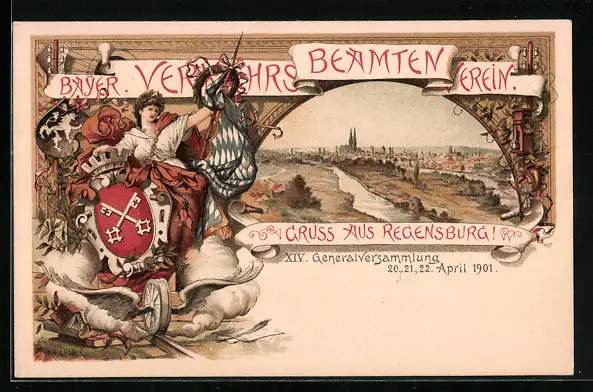 Lithographie Regensburg, XIV., Generalversammlung 1901, Teilansicht mit Kirche, Frau mit Wappen und Fahne