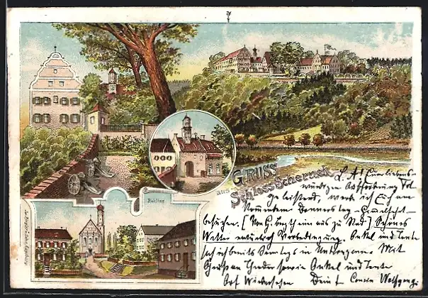 Lithographie Rehling, Schloss Scherneck & Ortsansicht
