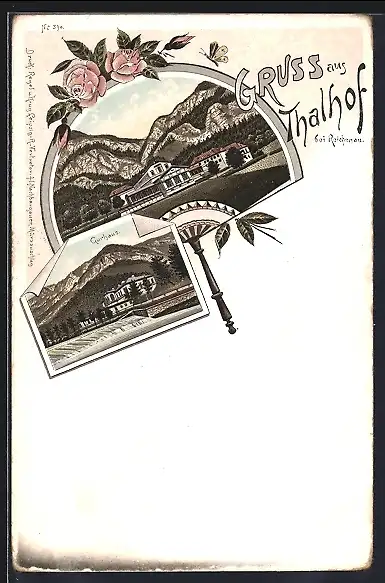 Lithographie Reichenau an der Rax, Thalhof, Curhaus und Ortsansicht, Fächer als Passepartout