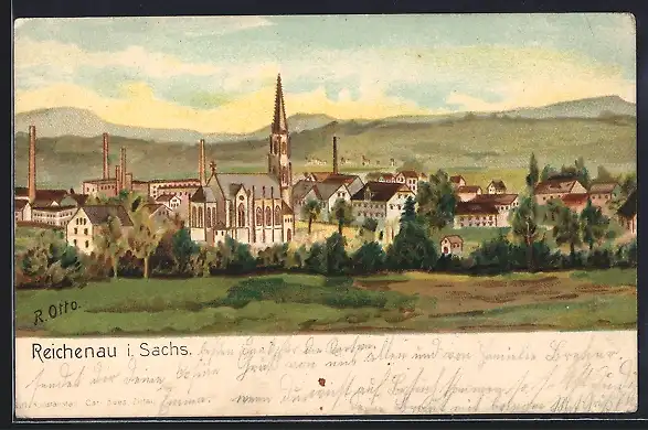 Lithographie Reichenau i. Sachs., Ortsansicht mit der Kirche