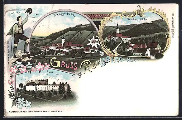 Lithographie Reinsberg /N.-Oe., Ortsansicht mit Ruine, Passepartout mit Bergsteiger