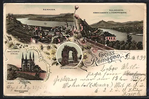 Lithographie Remagen, Ortsansicht, Appolinariskirche, Rolandsbogen, Rolandseck