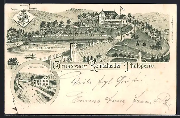 Lithographie Remscheid, Thalsperre und Mebusmühle
