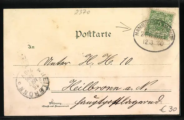 Personenbezogene Daten auf der Rückseite der Karte wurden durch blauen Textmarker unkenntlich gemacht. Die blauen Stellen sind auf die Vorderseite durchgeweicht und wirken sich negativ auf das Postkartenfoto aus