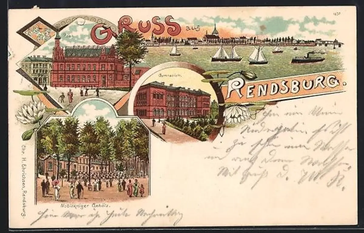 Lithographie Rendsburg, Nobiskrüger Gehölz, Gymnasium, Post