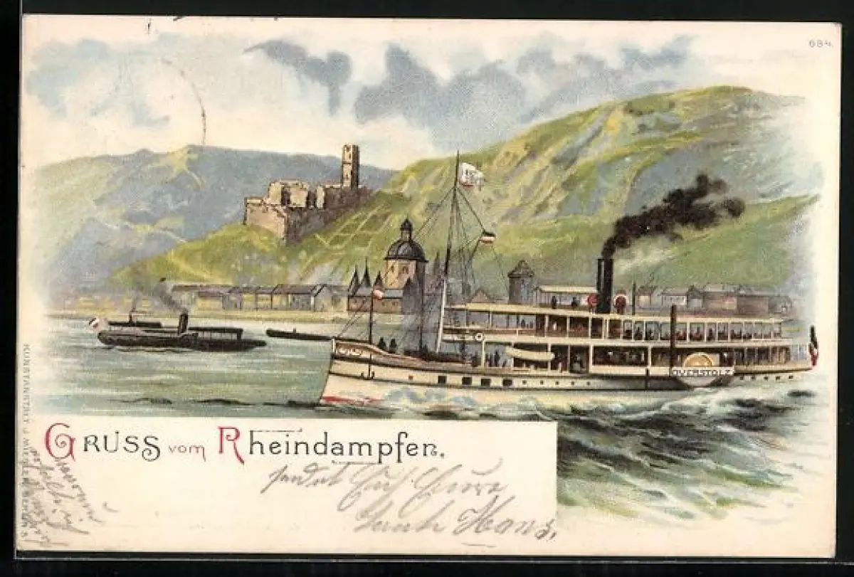 Lithographie Rheindampfer Overstolz fährt an einer Burg vorbei