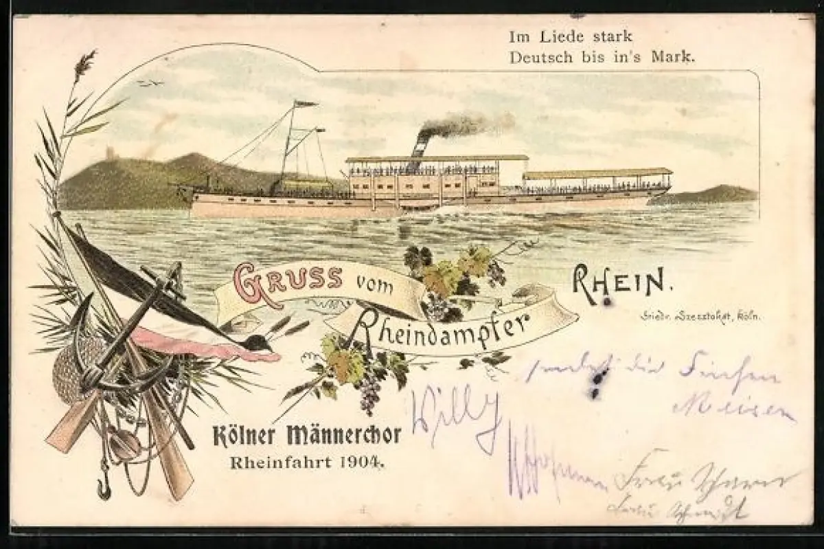 Lithographie Rheindampfer in Fahrt, Rheinfahrt des Kölner Männerchors 1904