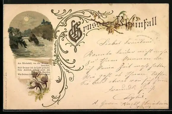 Lithographie Rheinfall, Wasserfall bei Vollmond, Gedicht