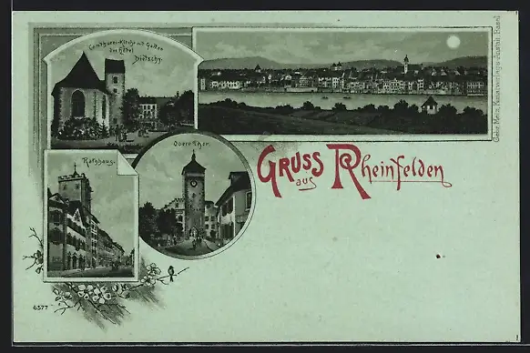 Lithographie Rheinfelden, Comthurei-Kirche mit Garten des Hotel Dietschy, Rathaus