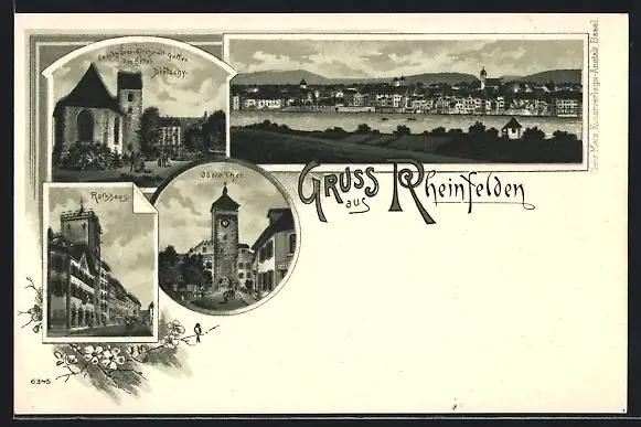 Lithographie Rheinfelden, Oberes Thor, Rathaus, Comthurei-Kirche mit Garten des Hotel Dietschy