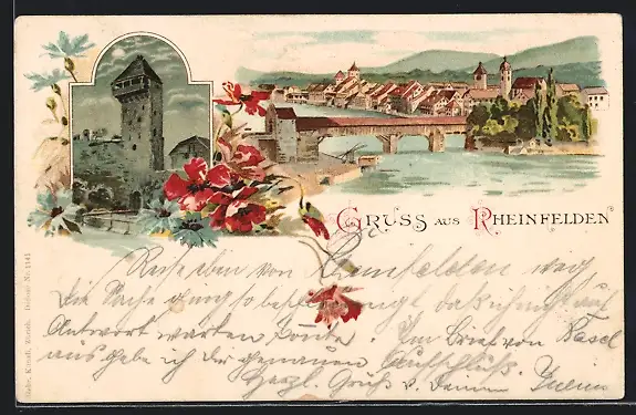 Lithographie Rheinfelden, Teilansicht mit Bürcke, Tor
