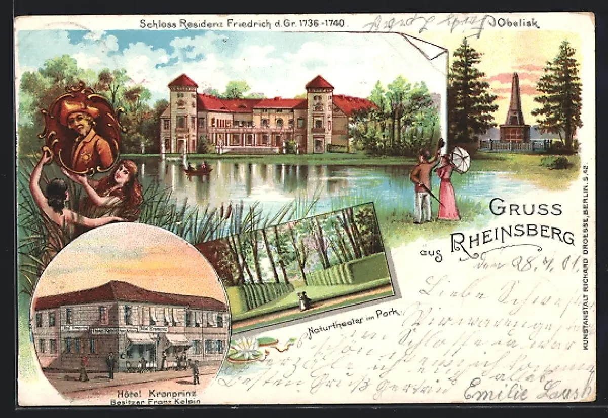 Lithographie Rheinsberg, Hotel Kronprinz, Bes. Franz Kelpin, Schloss Residenz Friedrich d. Gr., Obelisk, Naturtheater
