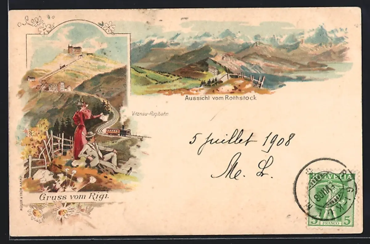 Lithographie Rigi, Aussicht vom Rothstock, Vitznau-Rigibahn