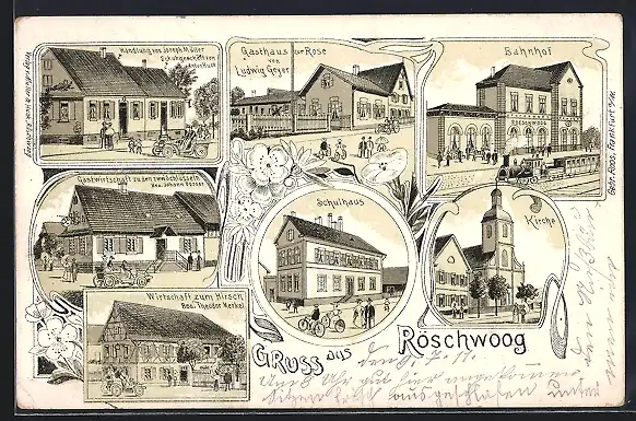 Lithographie Röschwoog, Gasthaus zu den zwei Schlüsseln, Gasthaus zum Hirsch von Theodor Merkel, Bahnhof, Schule