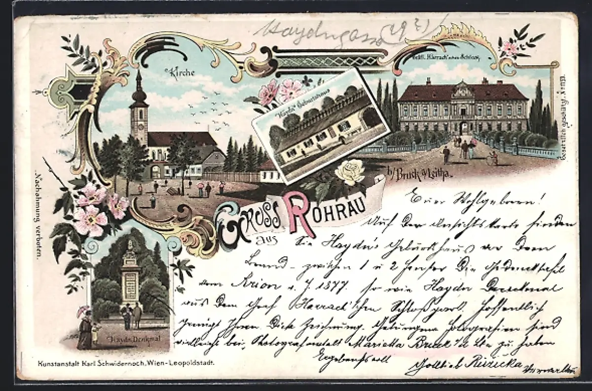 Lithographie Rohrau b. Bruck a. Leitha, Bräfl. Harrach`sches Schloss, Haydn Geburtshaus, Haydn Denkmal