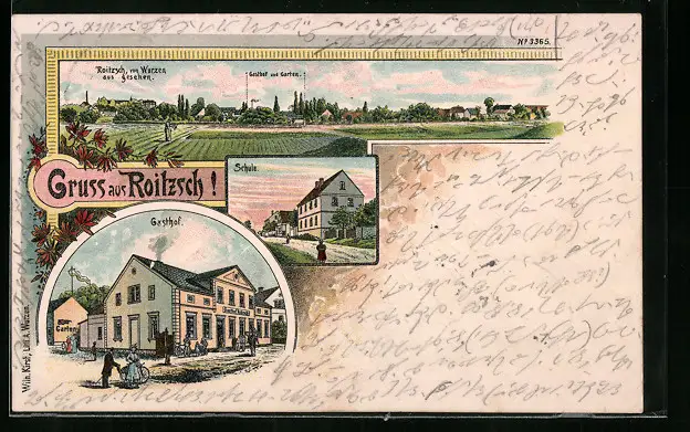 Lithographie Roitzsch, Gleichnamiger Gasthof, Schule und Totalansicht aus der Ferne
