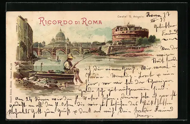 Lithographie Rom, Partie mit Angler am Castel S. Angelo