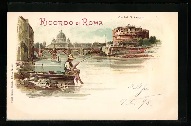 Lithographie Rom, Partie mit Angler am Castel S. Angelo