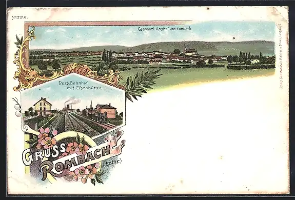 Lithographie Rombach /Lothr., Post-Bahnhof mit Eisenhütten, Totalansicht