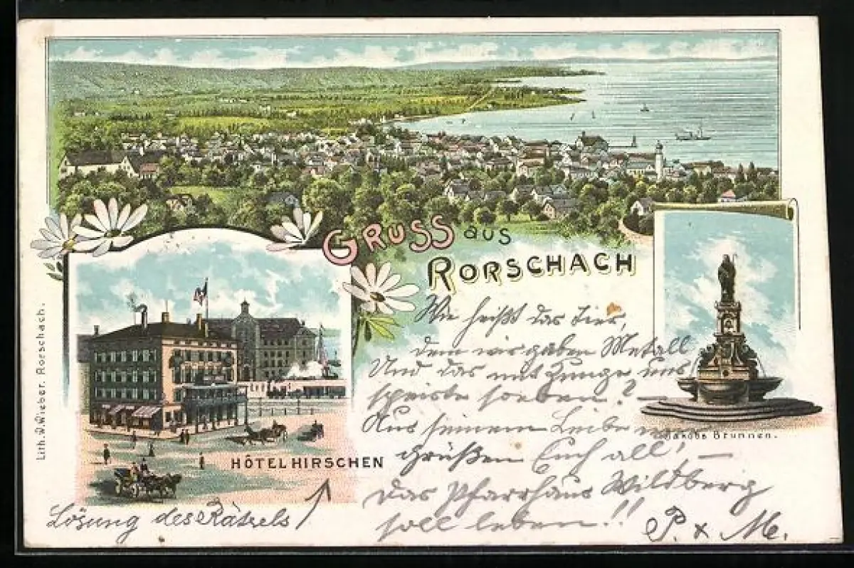 Lithographie Rorschach, Hotel Hirschen, Jakobs Brunnen, Ortsansicht aus der Vogelschau