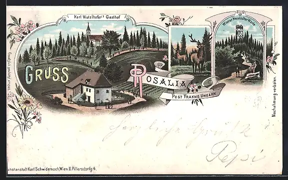 Lithographie Rosalia, Gasthof von Karl Wutzlhofer, Wiener Neustädter Warte, Hirsche im Wald