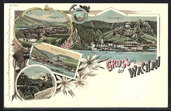 Lithographie Rossatz /Wachau, Totalansicht, Weissenkirchen, Aggstein und Dürrenstein